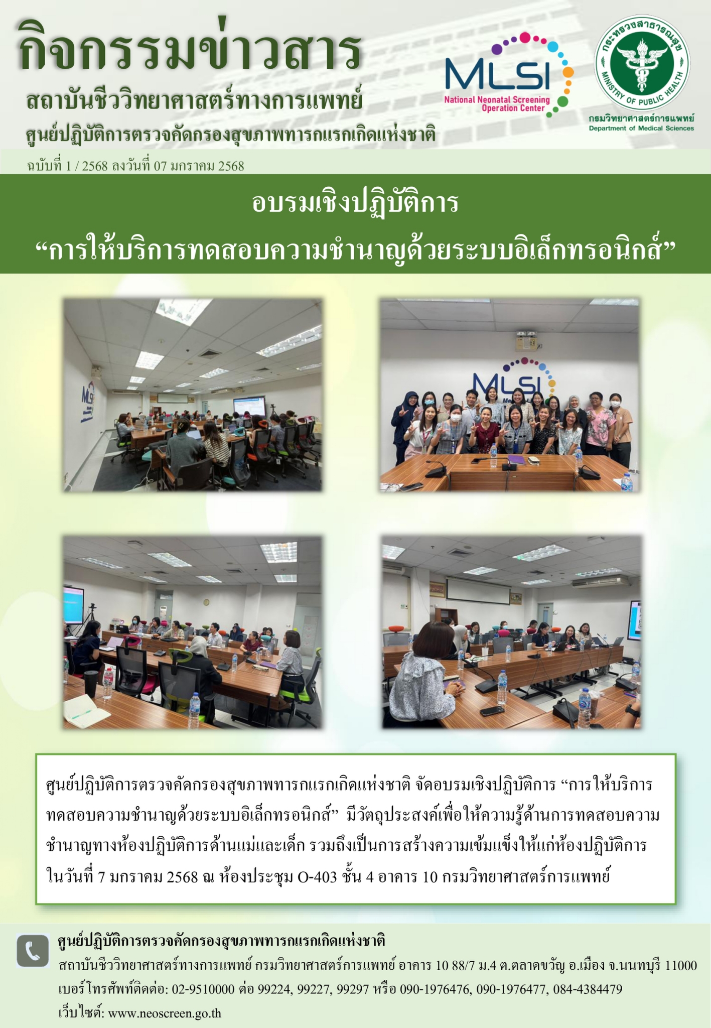 ศูนย์ปฏิบัติการตรวจคัดกรองสุขภาพทารกแรกเกิดแห่งชาติ ฯ จัดอบรมเชิงปฏิบัติการ"การให้บริการทดสอบความชำนาญด้วยระบบอิเล็กทรอนิกส์"ในวันที่ 7 มกราคม 2568 ณ ห้องประชุม O-403 ชั้น 4 อาคาร 10 กรมวิทยาศาสตร์การแพทย์