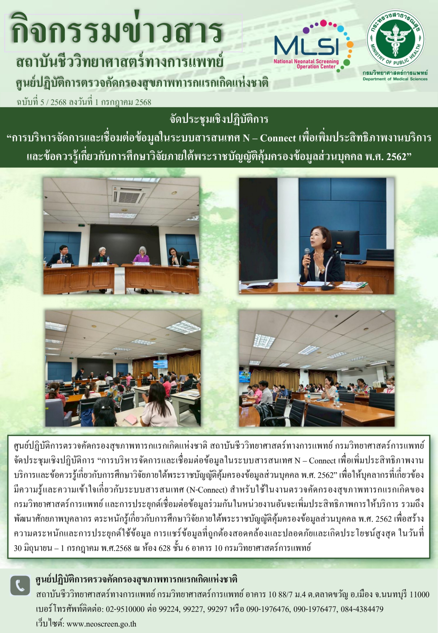 ศูนย์ปฏิบัติการตรวจคัดกรองสุขภาพทารกแรกเกิดแห่งชาติ สชพ. จัดประชุมเชิงปฏิบัติการ " การบริหารจัดการและเชื่อมต่อข้อมูลใน N-Connect เพื่อเพิ่มประสิทธิภาพและข้อควรรู้เกี่ยวกับการศึกษาวิจัยภายใต้พรบ. PDPA พ.ศ. 2562" ระหว่างวันที่ 30 ก.ย. - 1 ก.ค. 2568 ณ ห้องประชุม 628 ชั้น 6 อาคาร 10 กรมวิทยาศาสตร์การแพทย์